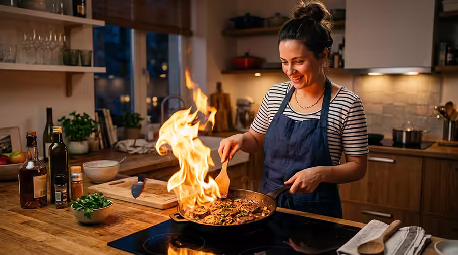 Домашня кухня теж підходить для цієї техніки, але лише за умови чіткої підготовки. Саме через ризикованість фламбування не любить хаосу, поспіху, зайвих рухів і випадкового “десь зараз підпалю”.