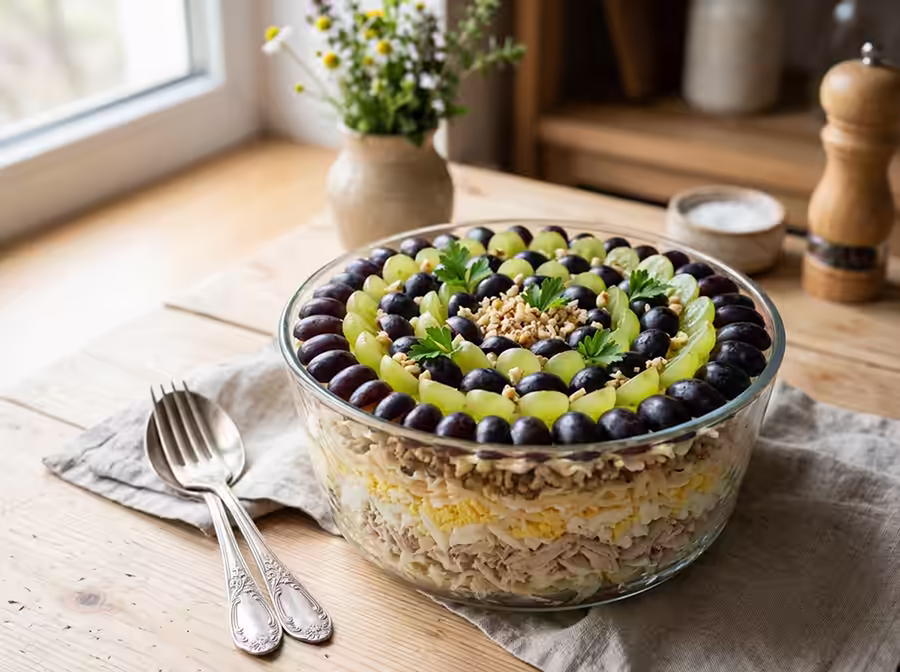 Салат Тіффані з куркою та виноградом заслужено став популярним у домашній кулінарії, бо поєднує одразу кілька важливих переваг: доступність продуктів, простоту приготування, ефектний вигляд і приємний збалансований смак. Саме тому він залишається актуальним вибором для святкового меню, коли хочеться приготувати щось красиве, перевірене й справді апетитне.