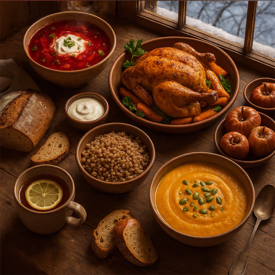 • сезонних та доступних продуктах (капуста, буряк, морква, картопля, яблука, квашені овочі);